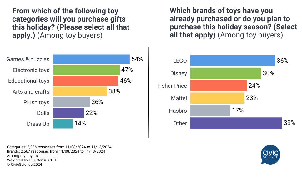 Per CivicScience’s yearly toy tracking, toys are set to play a slightly larger role in holiday shopping this year. Sixty-four percent of U.S. adults plan to purchase toys this holiday season (up 2pp from 2023), and 14% expect to spend over $200 (up 3pp from 2023). Toy-buyers are most likely to shop for toys at online-only retailers, such as Amazon, followed by big-box stores (either in person or online) – while shopping at online-only retailers has increased, shopping at big-box stores has decreased from last year. Lastly, games, puzzles, electronics, and educational toys are expected to be the most popular this year, especially from brands like LEGO and Disney. Read more here, including what factors are most important to toy buyers. Â