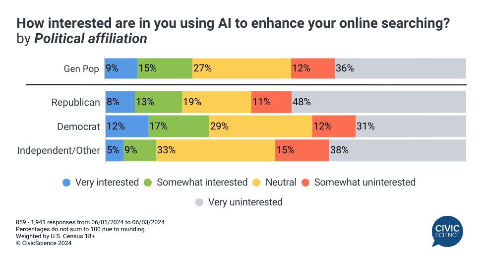 Democrats hold the strongest level of interest in utilizing AI-supported search (29%), while a majority (59%) of Republicans and Independents (53%) aren’t interested.