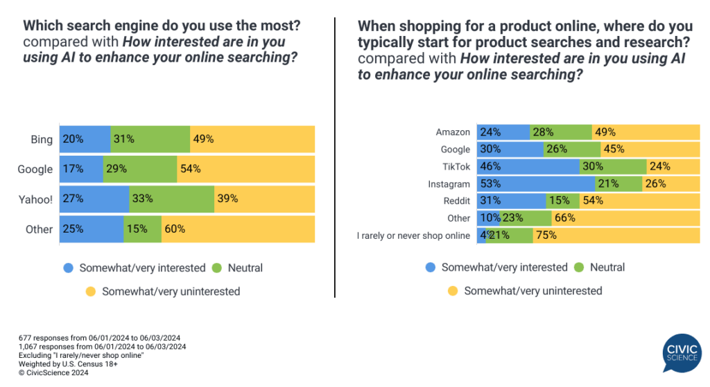 Product research for online shopping adds an interesting dynamic to the mix, especially for those starting on social media. Consumers who begin their research on Instagram are the most open to AI-enhanced search, followed by those on TikTok. However, those who turn to Reddit for product research are less likely to be interested in AI assistance, aligning with recent CivicScience findings that Redditors tend to be wary of AI tools like ChatGPT.