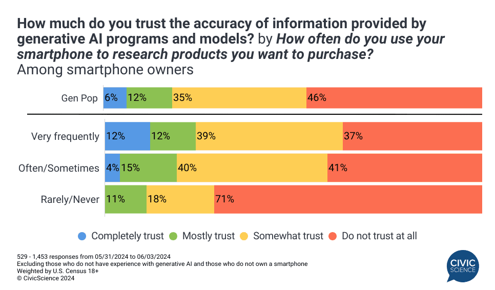 Accuracy issues in information provided by AI tools are certainly not new and are something that consumers are leery about. A majority of those with experience with generative AI technology hold at least some level of trust in the credibility of the information provided, but 46% hold no trust at all, and just 6% say they ‘completely’ trust it. However, trust levels jump significantly among those who frequently use their smartphones to research products they want to buy.