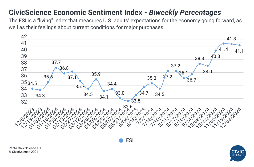 The latest biweekly reading of the Penta-CivicScience Economic Sentiment Index (ESI) decreased by 0.2 points to 41.1, marking a minor dip in overall economic confidence as the holiday shopping season begins.