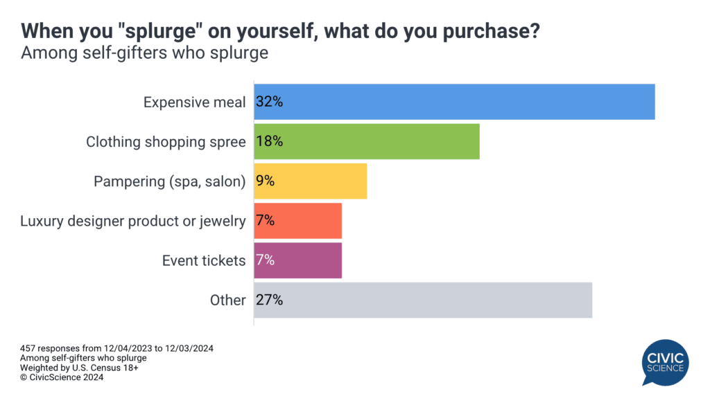 It may come as no surprise that self-gifters also enjoy splurging on themselves. CivicScience data show that nearly 70% of self-gifters also splurge on purchases for themselves beyond the holidays. Among self-gifters who splurge, the most common spending categories are an expensive meal or liquor (32%), a clothing shopping spree (18%), or pampering such as salon or spa treatments (9%).